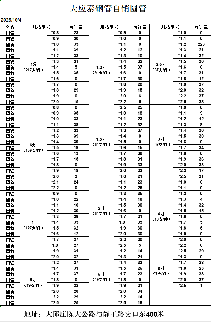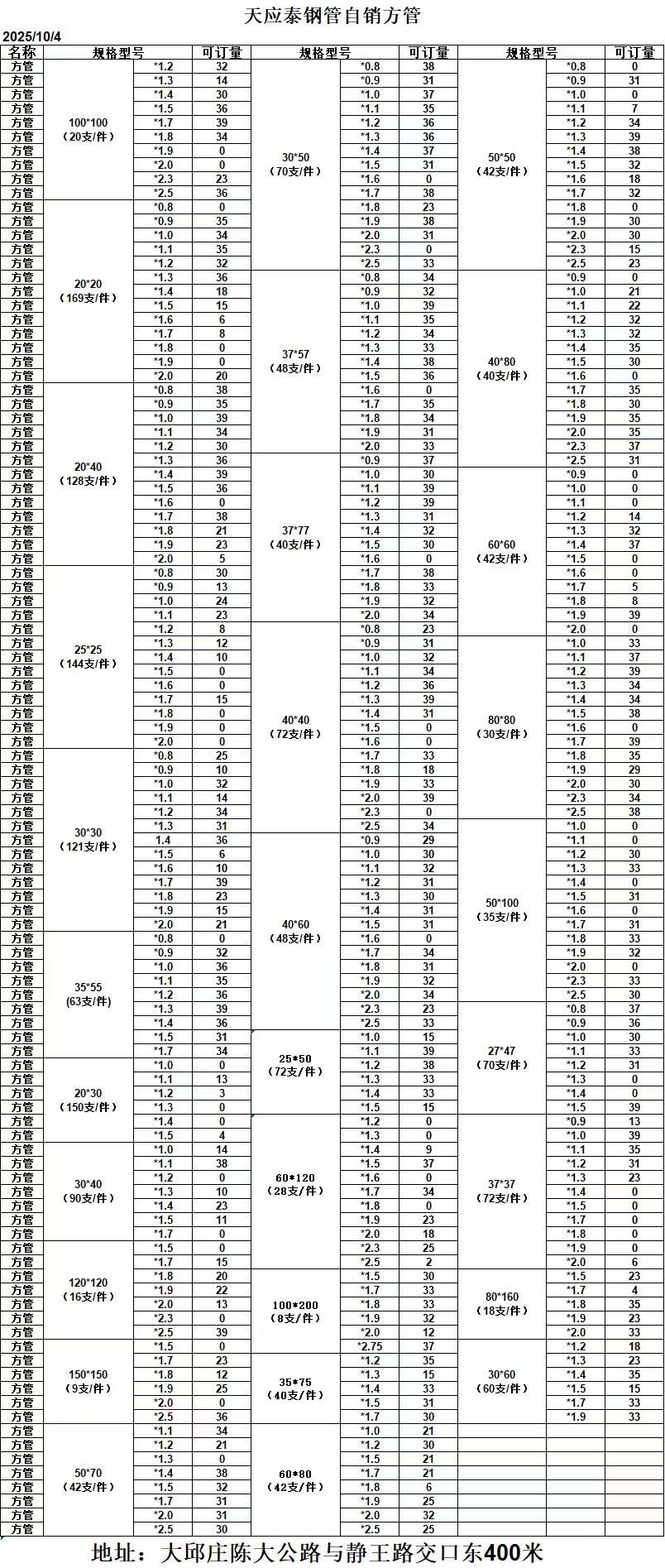 tyc7111cc太阳成集团10.4方管、圆管库存