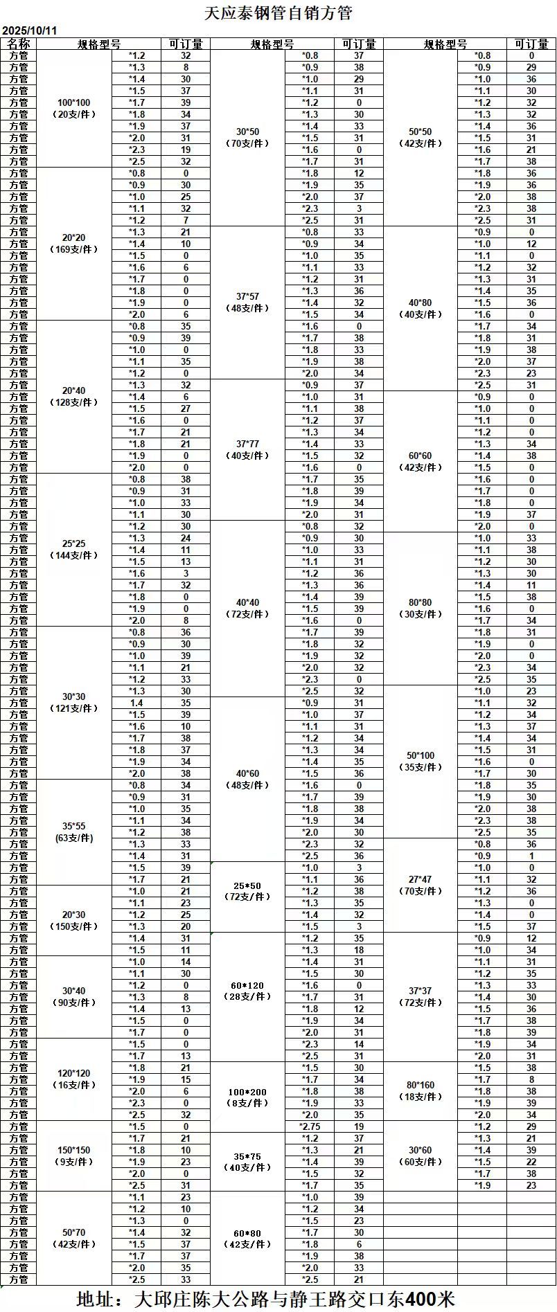 tyc7111cc太阳成集团10.11方管、圆管库存
