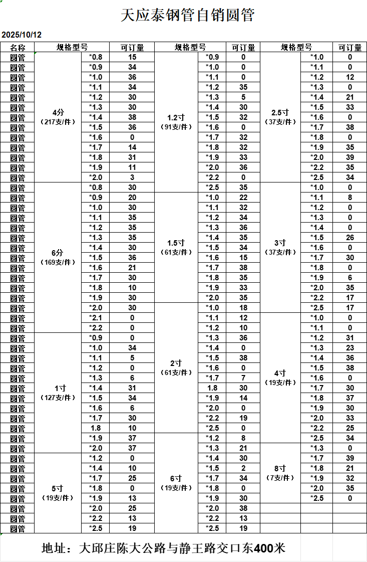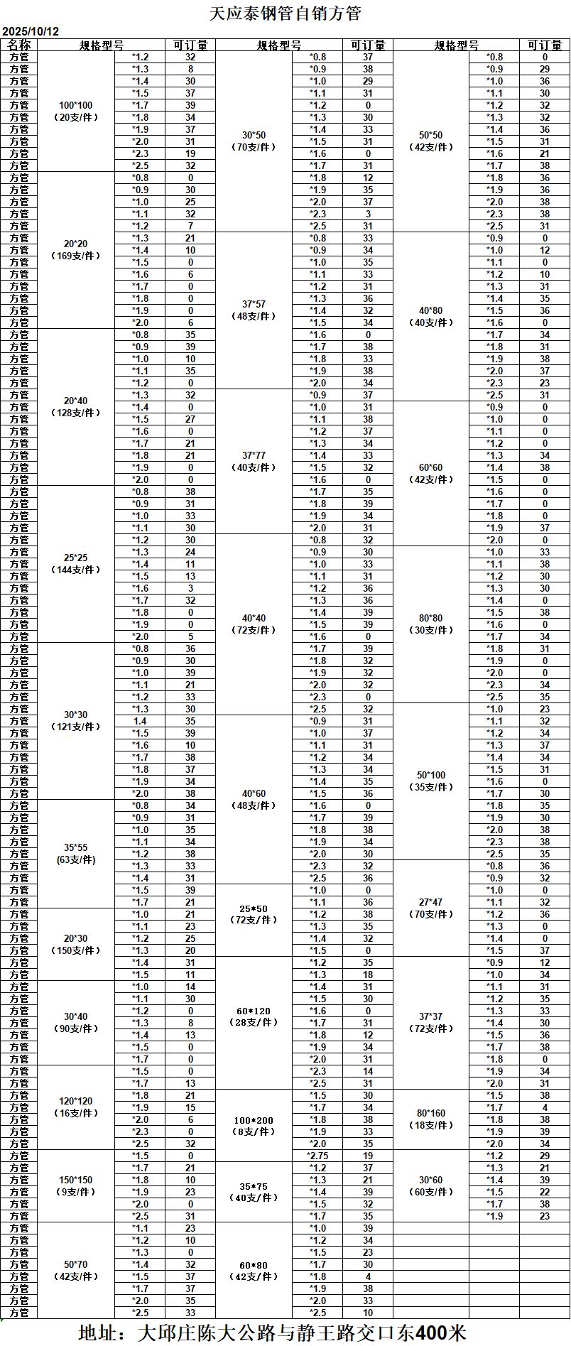 tyc7111cc太阳成集团10.11方管、圆管库存