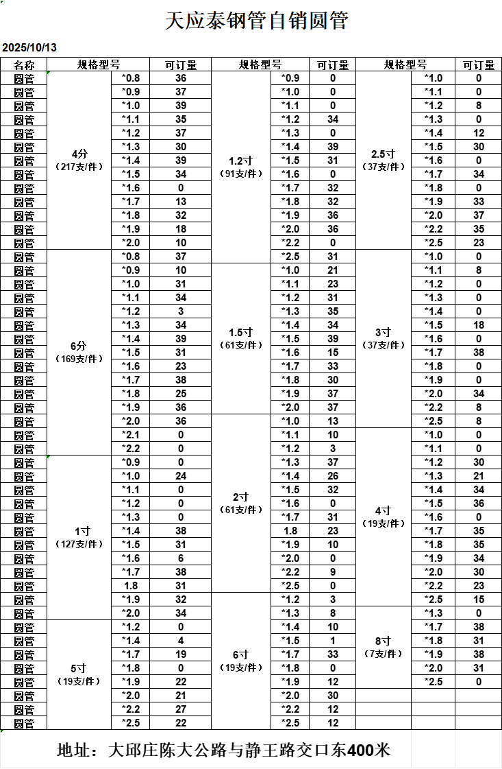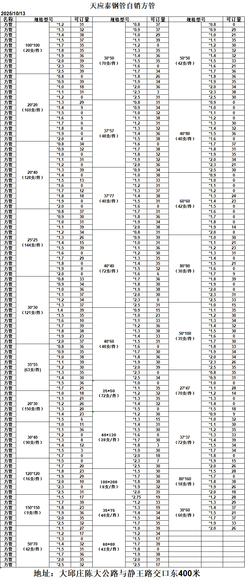 tyc7111cc太阳成集团10.13方管、圆管库存