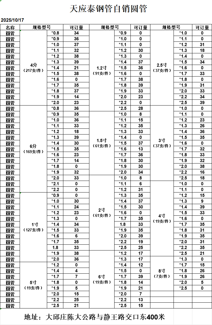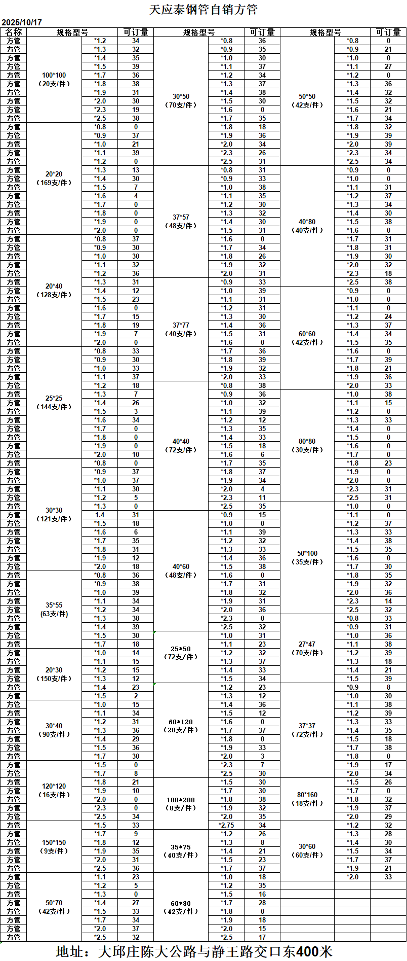 tyc7111cc太阳成集团10.17方管、圆管库存
