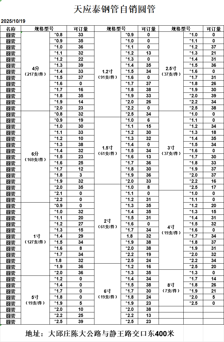 tyc7111cc太阳成集团10.19方管、圆管库存