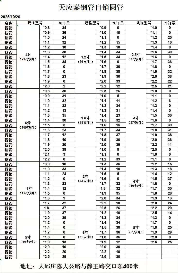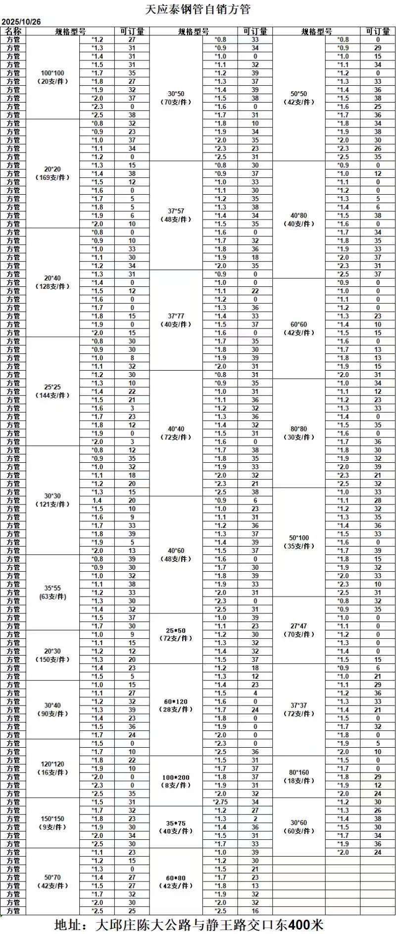 tyc7111cc太阳成集团10.26方管、圆管库存